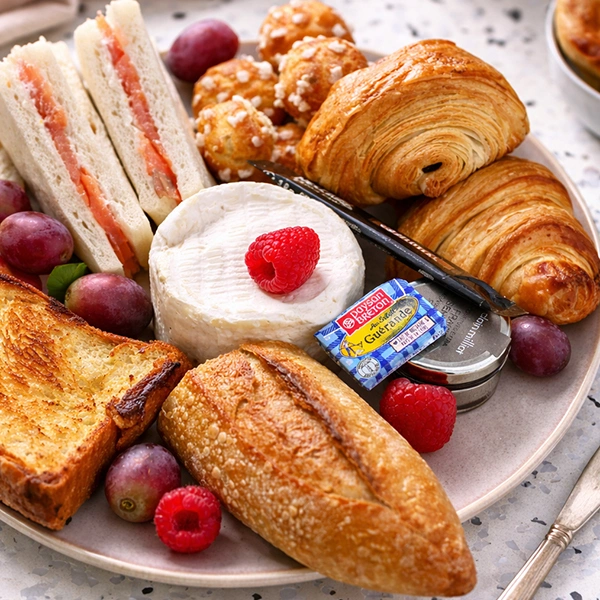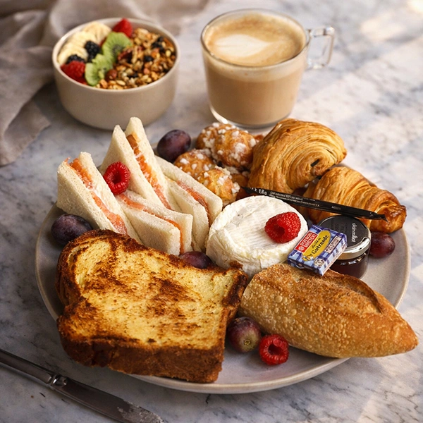 Duo de mini viennoiserie, chouquette, petit pain baguette, beurre demi sel, confiture fraise ou abricot, pain perdu caramel beurre salé, jus d’orange pressé, granola, fromage à la coupe, club sandwich au saumon), sachet de café instantanée ou thé