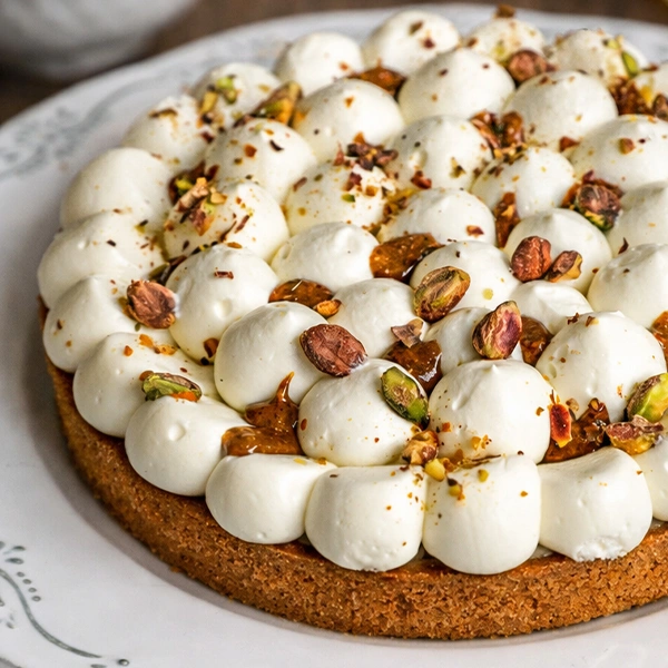 pate sucré amande, praliné pistache, biscuit dacquois pistache, ganache pistache, ganache fleur d’oranger.